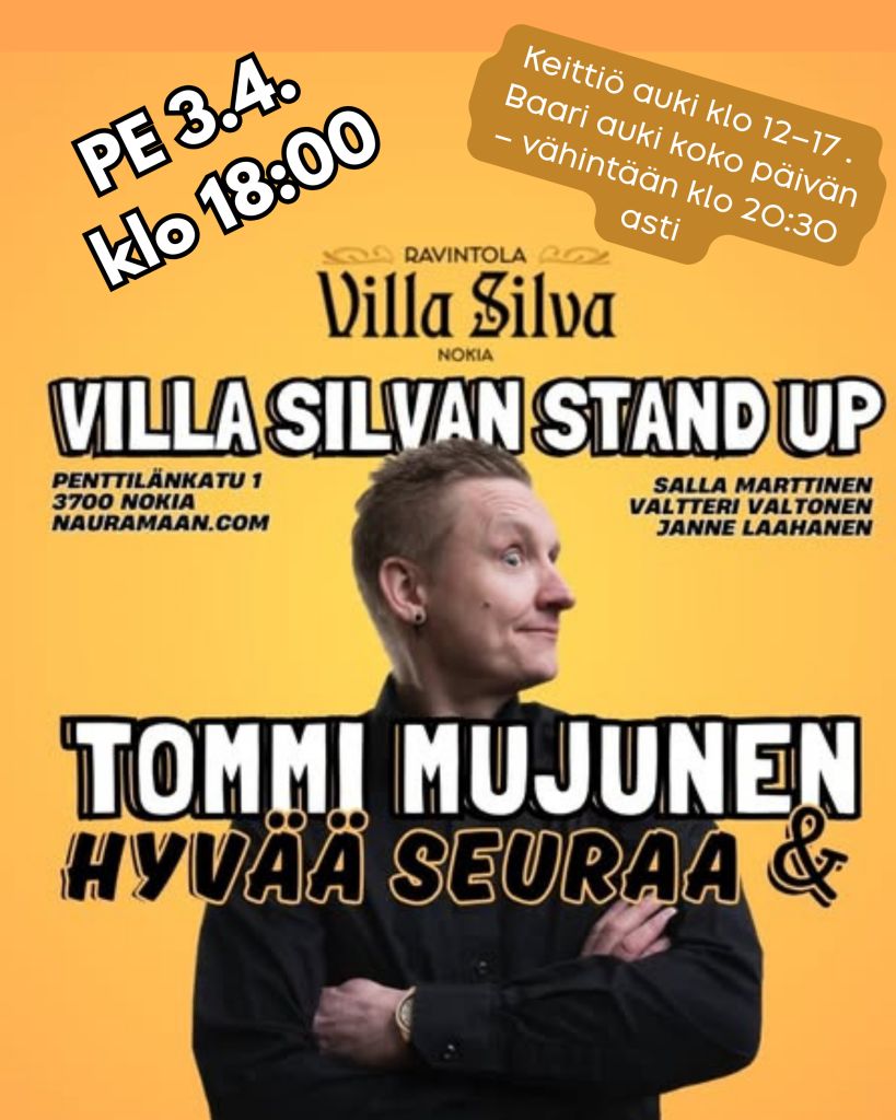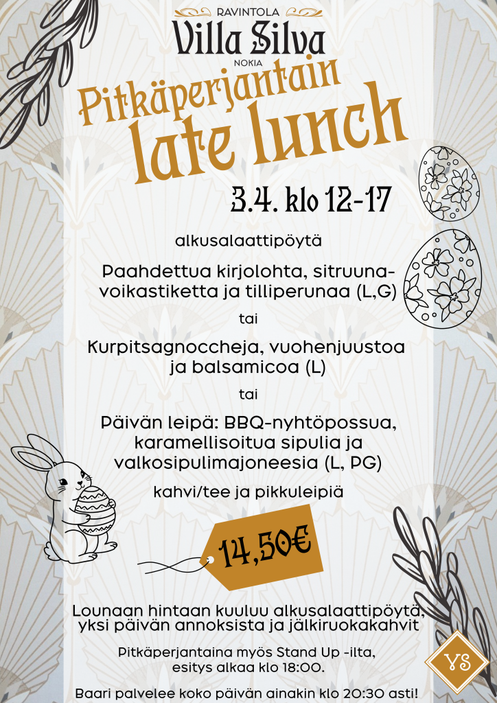 Ravintola Villa Silvassa lounas tarjolla arkisin klo 11-14, ravintola auki klo 14:30 asti.