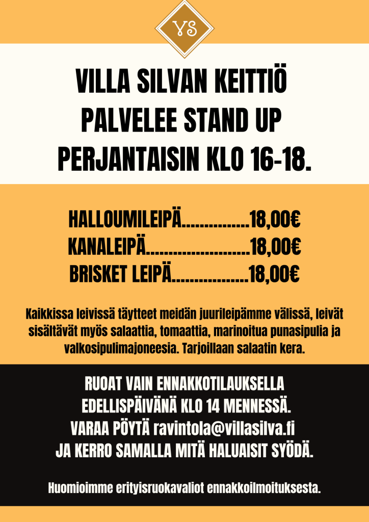 Villa Silvan keittiö on avoinna stand up -perjantaisin klo 16-18, sekä ennen lauantain esitystä klo 14:30-16:30.