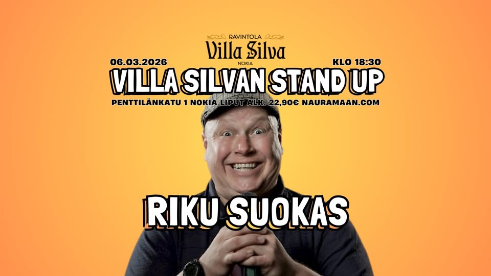 Riku Suokas tuo stand up -soolonsa Ravintola Villa Silvan vintille. Sinne samaan, jossa on istuttu synttäreitä, häitä, työporukan “käydään yhdellä” -iltoja ja päätetty, ettei tästä nyt ihan vielä kotiin lähdetä.