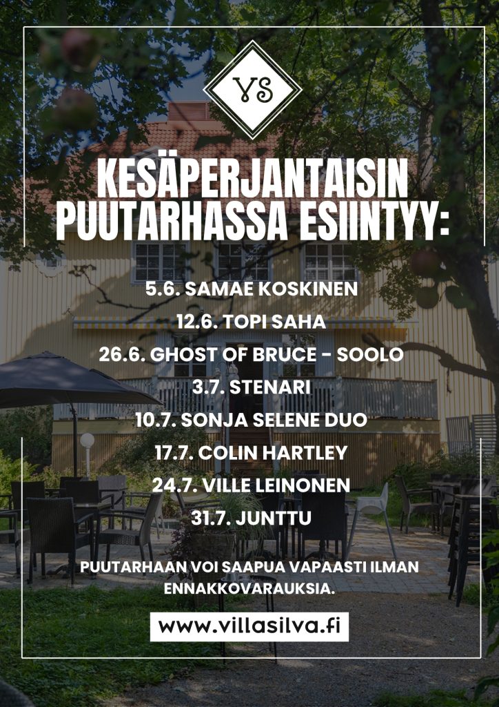 Myös tänä kesänä Villa Silvan akustinen puutarha herää eloon pääsymaksuttomien keikkojen myötä. Live-musiikista pääsee nauttimaan läpi kesän, ja esiintymiset järjestetään säästä riippumatta – kovan sateen tai myrskyn sattuessa siirrymme viihtyisiin sisätiloihin.