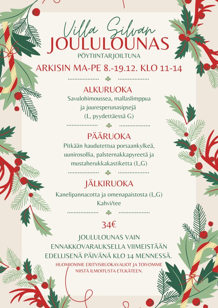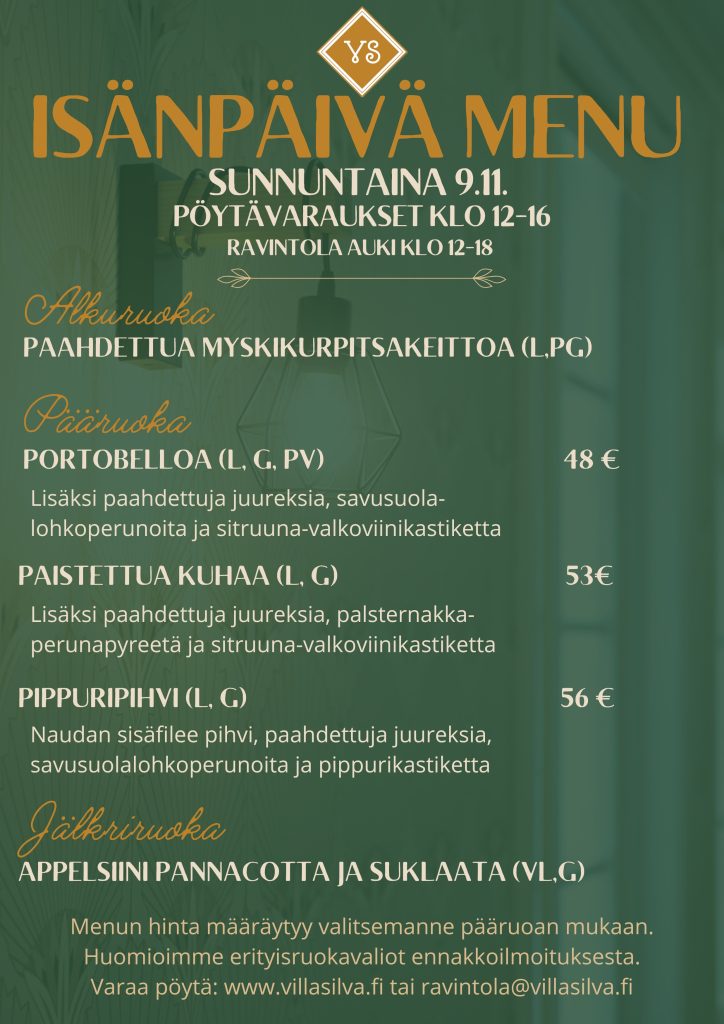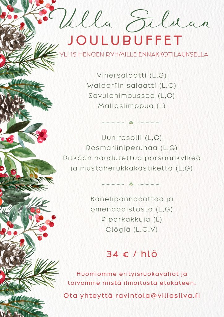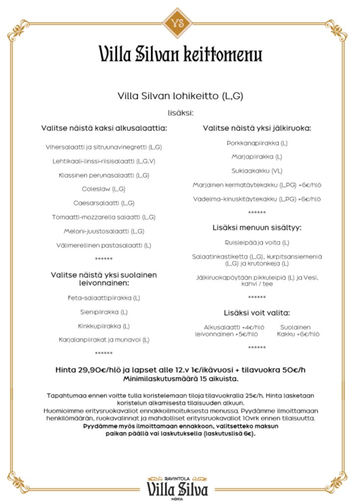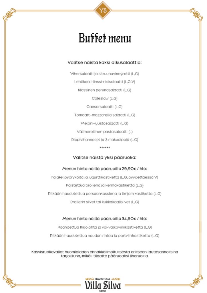 Menu Menu Spesiaali menut Lue lisää spesiaalimenuista 3 ruokalajin menu Kolmen ruokalajin menu on saatavilla vähintään 8 hengen yksityistilaisuuksiin. Menu tarjoillaan pöytiin. Buffet menu Buffetmenut myynnissä vain yksityistilaisuuksiin ja buffetmenuissa minimilaskutus 15 aikuista. Kahvitus menu Kahvitusmenut myynnissä vain yksityistilaisuuksiin ja kahvitusmenuissa minimilaskutus 10 aikuista. Kokouspaketit Avaa tästä pdf-tiedosto: Kokousmenut